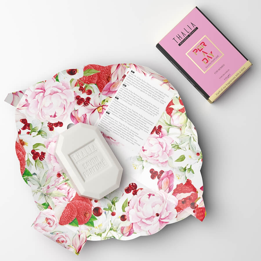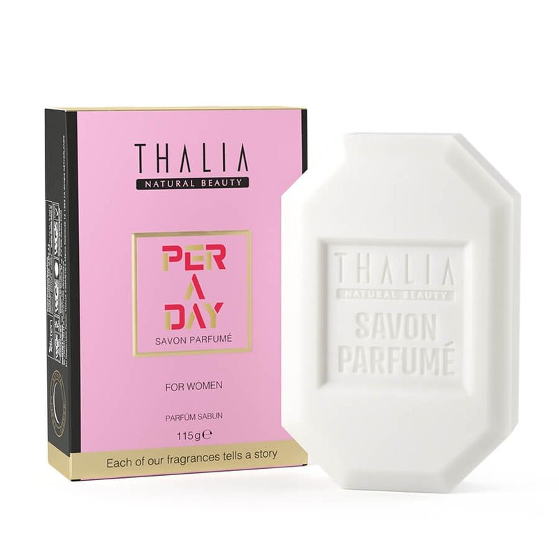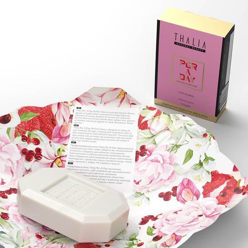 Thalia Per A Day Parfüm Sabunu, yumuşak köpüklü dokusu, egzotik ve baştan çıkarıcı özü ile rahatlatıcı bir banyo deneyimi ile tüm yorgunluğunuzu atmak için tasarlandı. Armut, pembe biber, şakayık, erik, yasemin ve kehribar kokularıyla günlük bakımınızı egzotik bir zevke dönüştürün. Kostik ajan içermez.